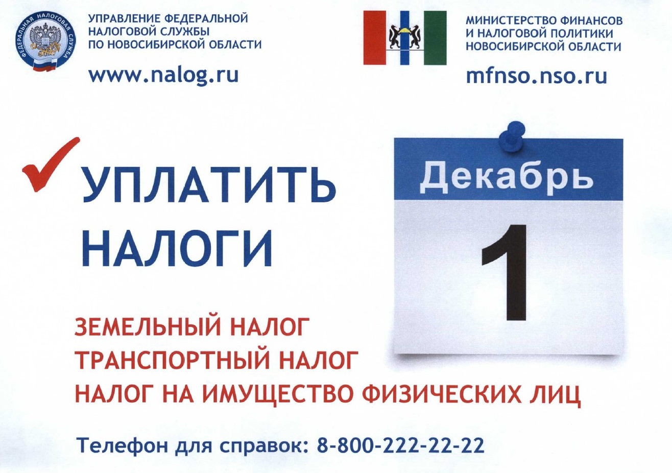 Управление Федеральной налоговой службы по Новосибирской области и Правительство Новосибирской области напоминают, что не позднее 1 декабря 2017 года физические лица - собственники имущества обязаны уплатить земельный налог, транспортный налог и налог на имущество физических лиц за 2016 год.